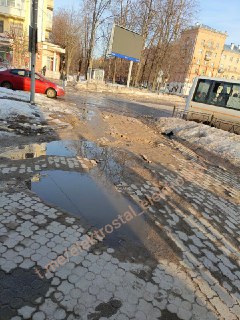 Пересечение двух центральных улиц города — это место, где тротуар сошёл вместе со снегом.