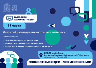 🤗 Жители городского округа приглашаются на выездную администрацию, которая пройдёт 31 марта в 17:00 в Центральной городской библиотеке им. К.Г. Паустовского по адресу: пр-т Ленина, д. 36.